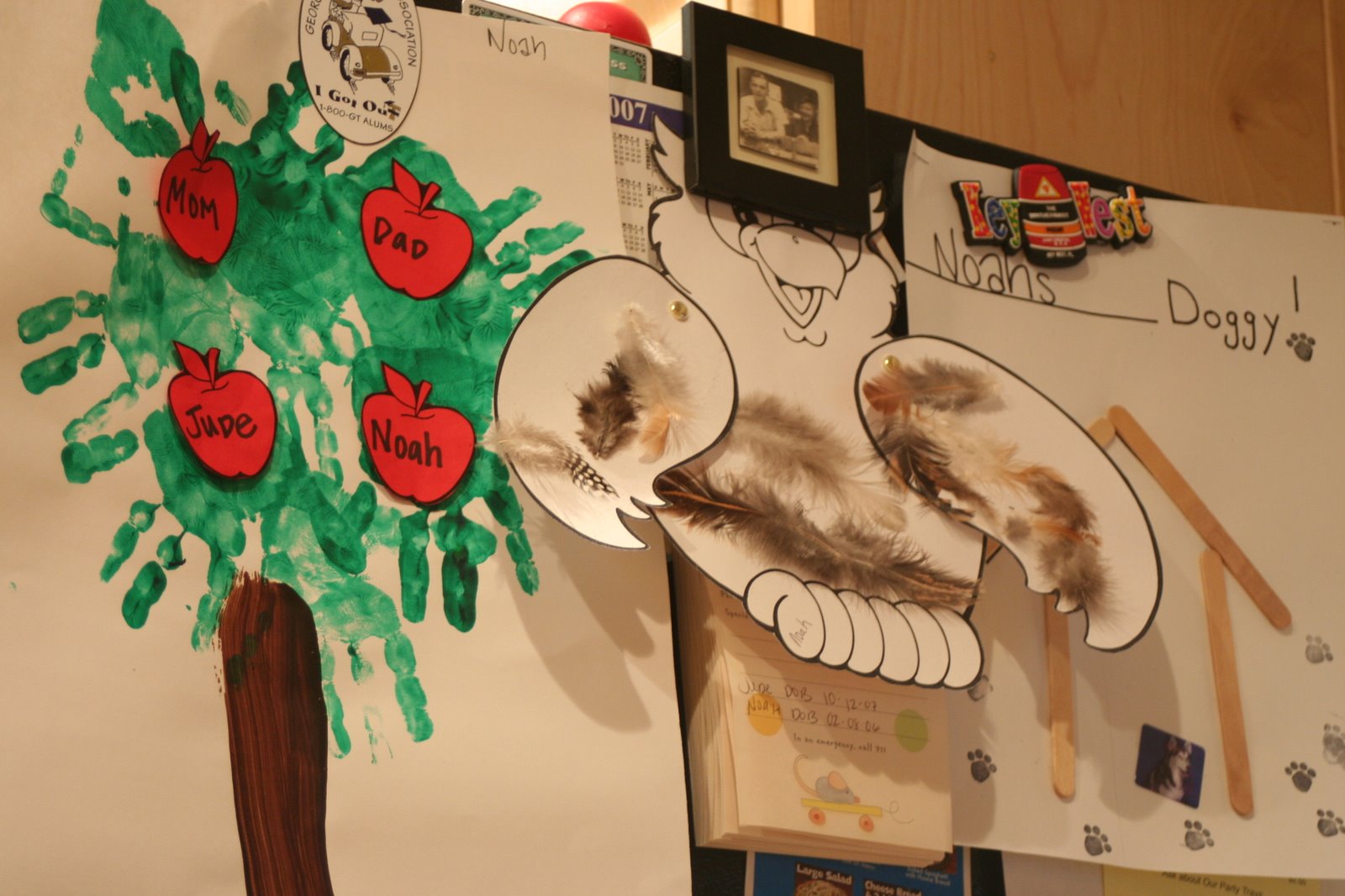 In the above picture, we have our family tree (sans Bells), his owl inspired from reading Owl Babies, and his dog house from